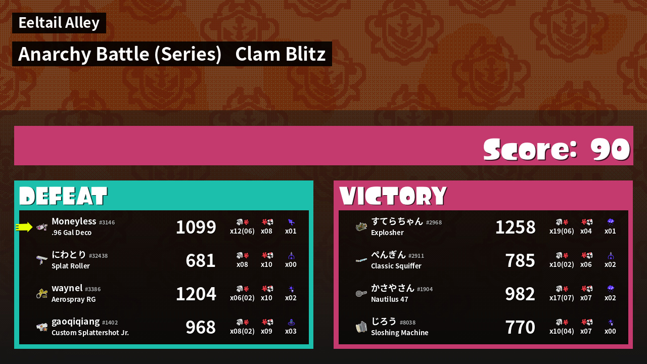 | Medals | #1 Overall Splatter #1 Clam Carrier #1 Popular Target | ||