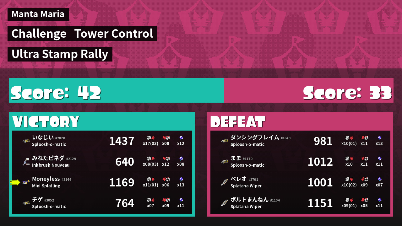 | Weapon | Mini Splatling ( Burst Bomb / Ultra Stamp) | ||
