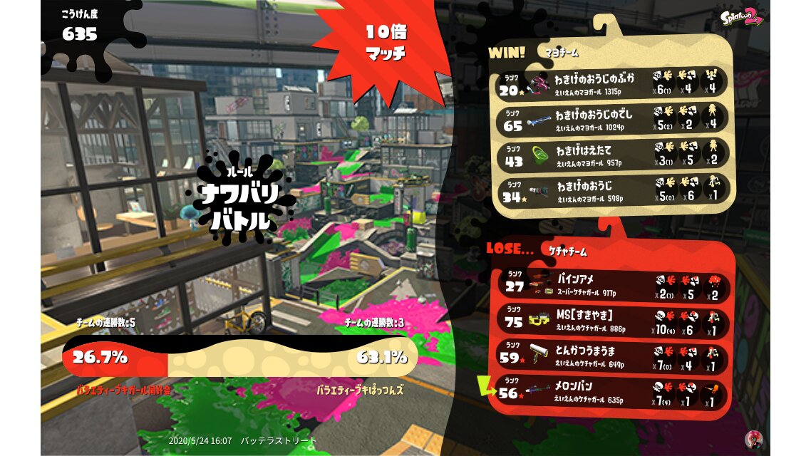 | Team マヨ バラエティーブキぱっつんズ Win Streak: 3 | 3,894 | 15 / 17 | 0.88 46.88% | ||||