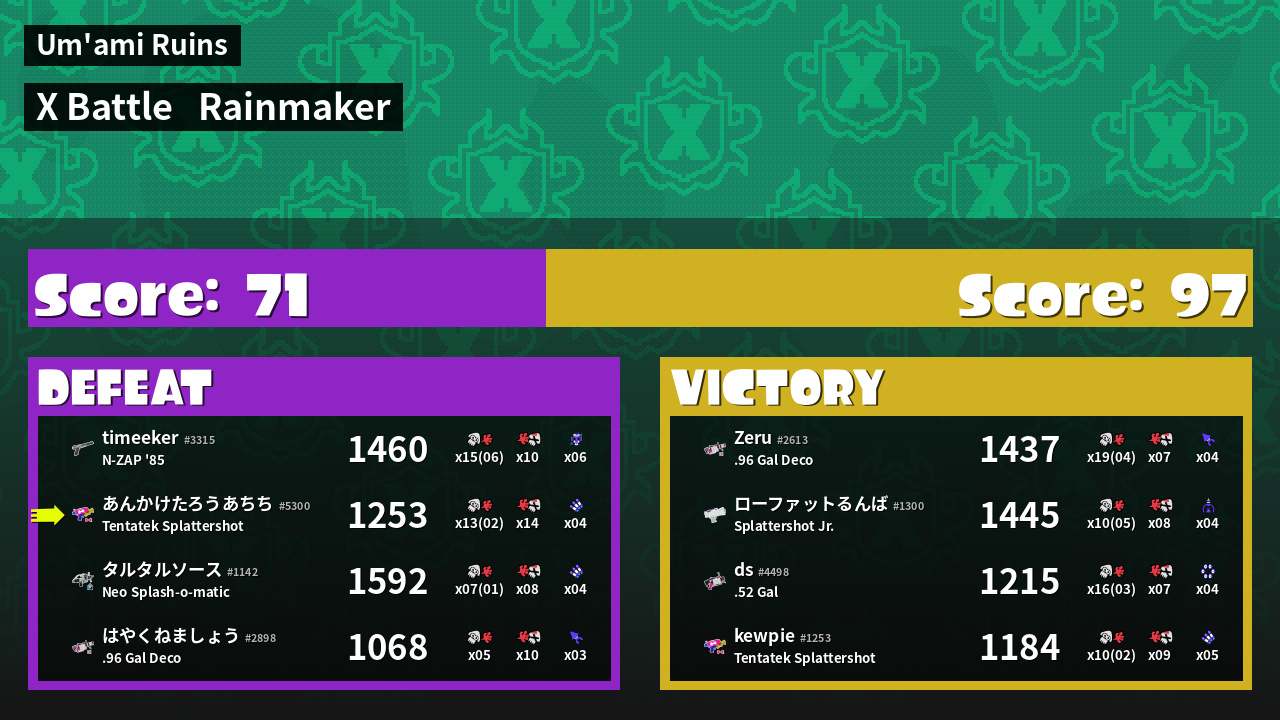 | Medals | #1 Super Jump Spot #1 Enemy Splatter #1 Rainmaker Stopper | ||