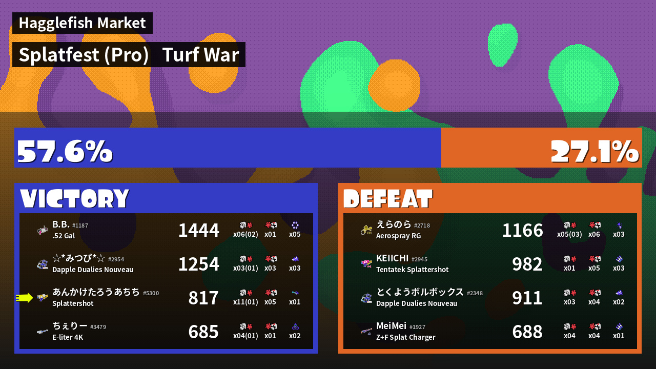 | Medals | #1 Overall Splatter #1 Enemy Splatter #2 Enemy-Base Inker | ||