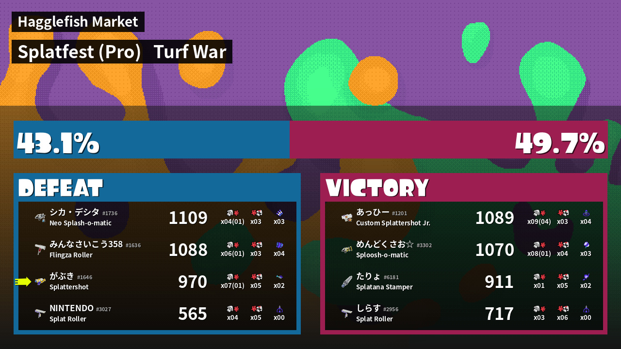 | Medals | #1 Overall Splatter #1 Enemy Splatter #1 Splat Assister | ||