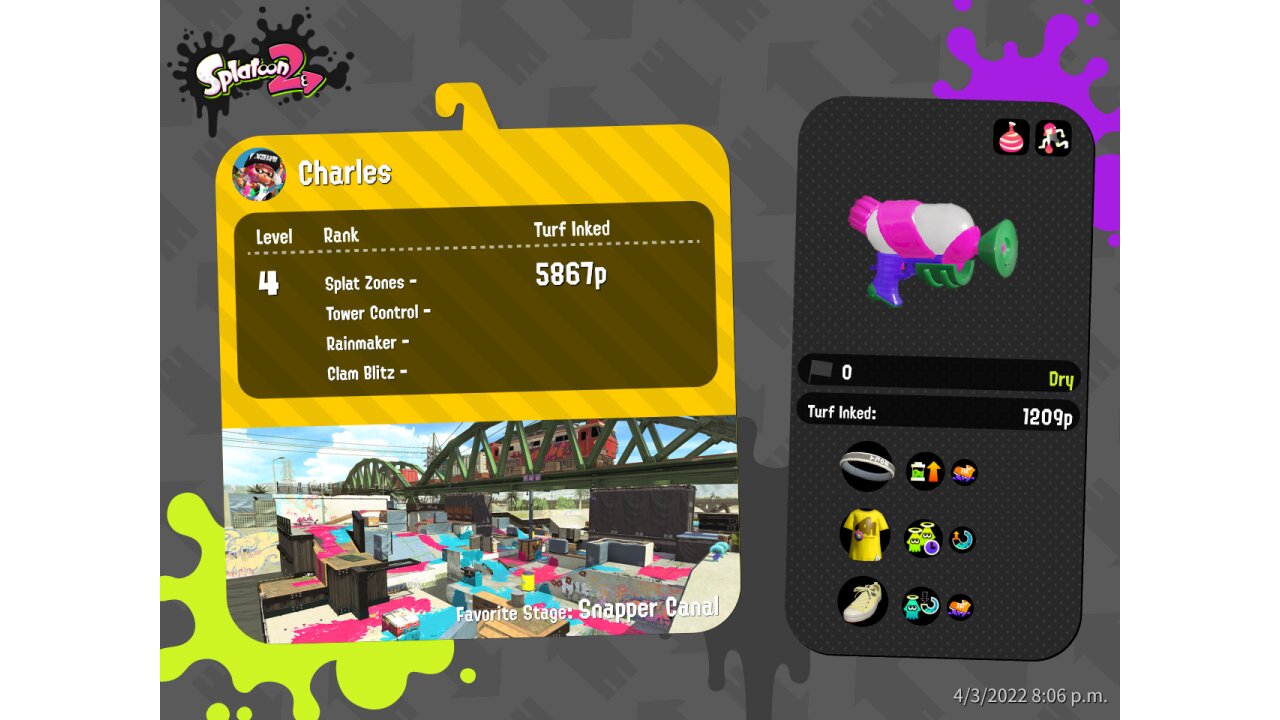 | Weapon | Splattershot ( Burst Bomb, Splashdown) | ||||||||||||||||||||||||||||||||||