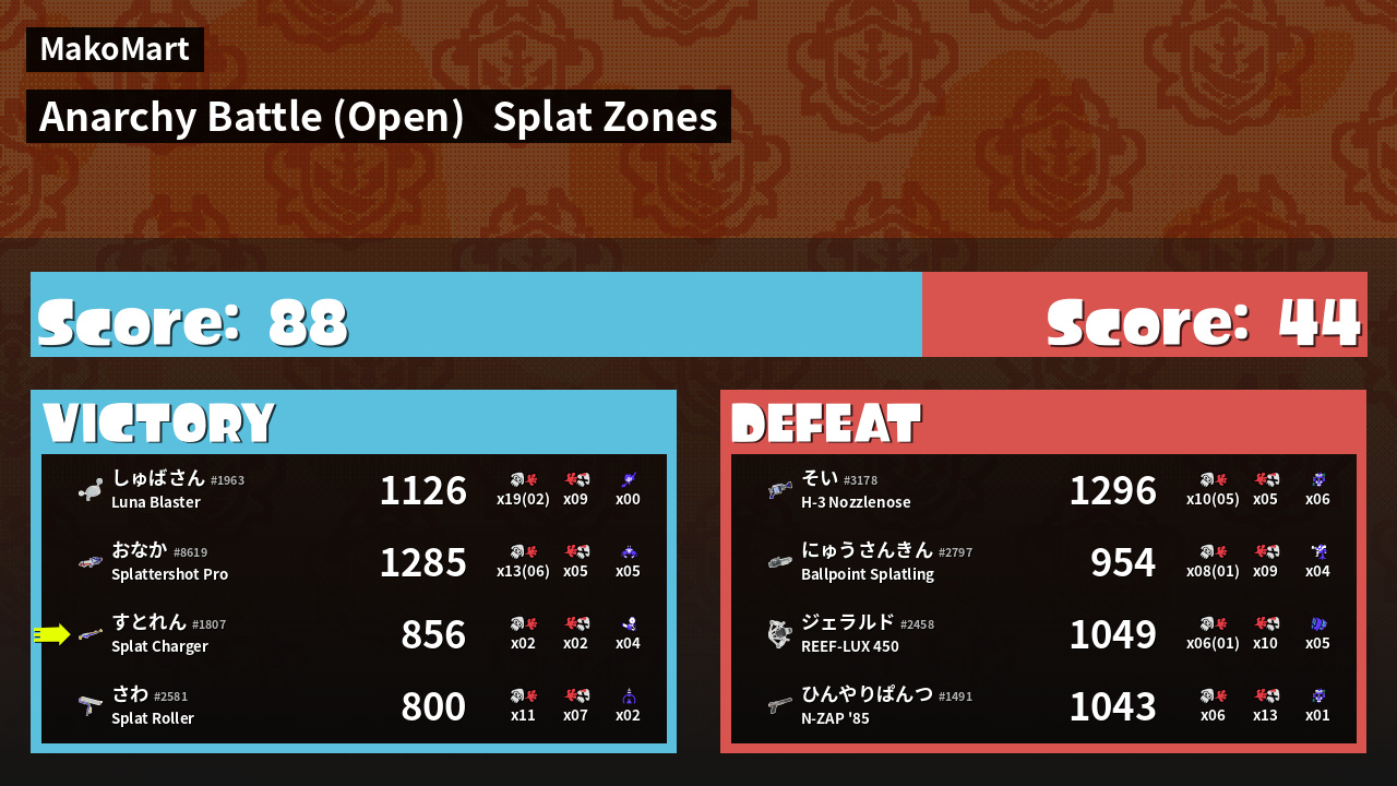 | Mode | Splat Zones - Anarchy Battle (Open) | ||