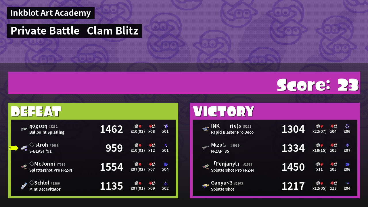| Medals | #1 Overall Splatter #1 Enemy Splatter #1 Clam Stopper | ||