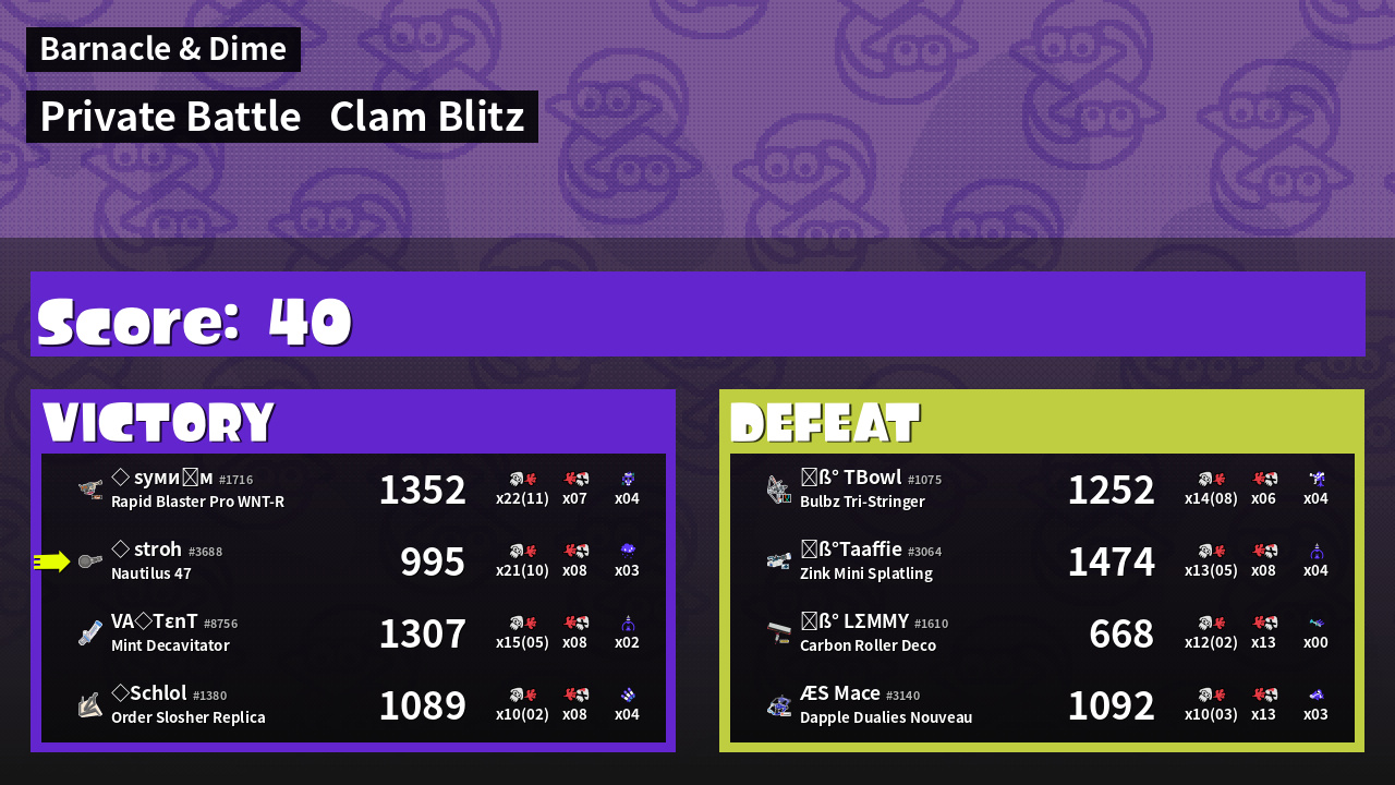 | Medals | #1 Score Booster #1 Clam Carrier #1 Enemy Splatter | ||