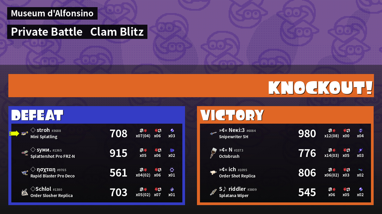 | Medals | #1 Overall Splatter #1 Clam Carrier #1 Splat Assister | ||