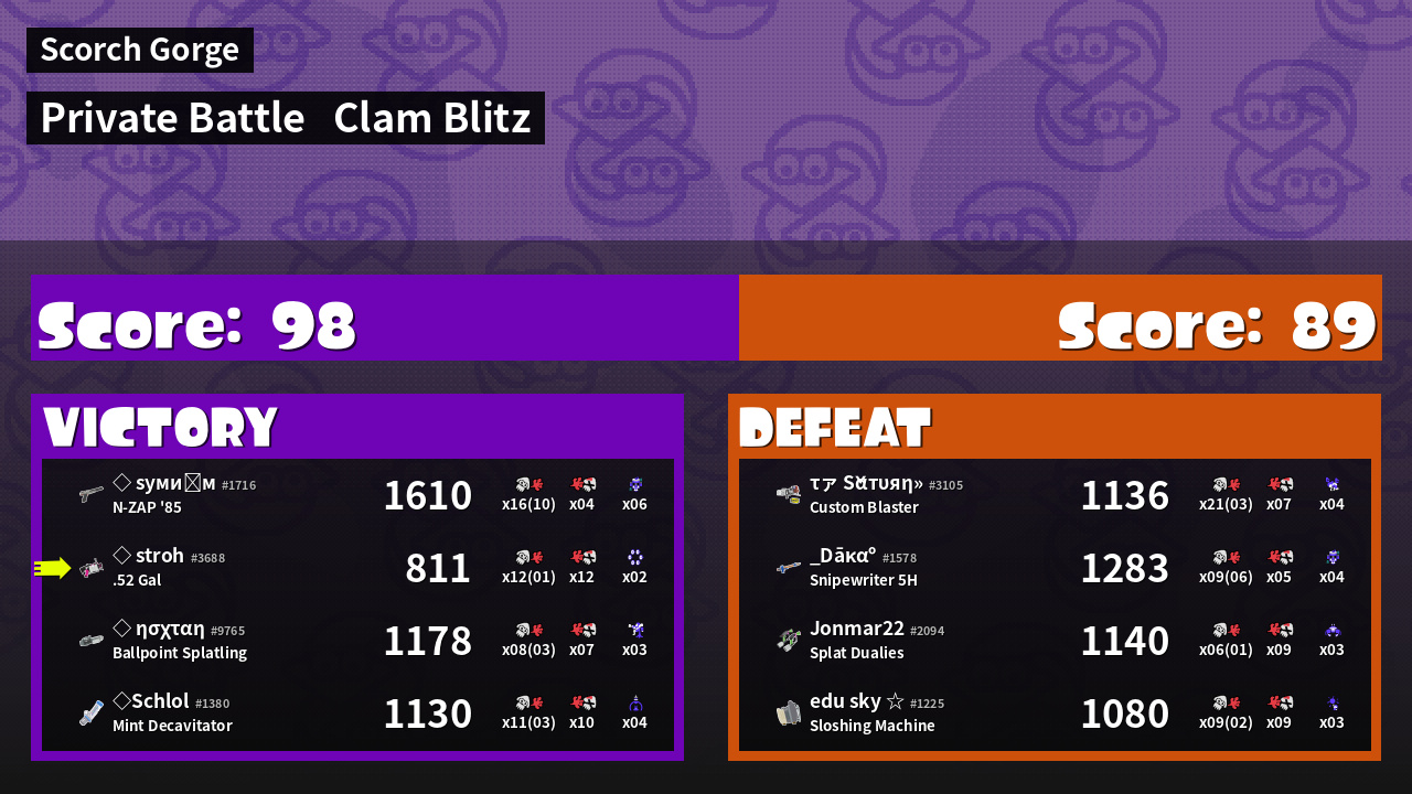 | Medals | #1 Clam Carrier #1 Enemy Splatter First Splat! | ||