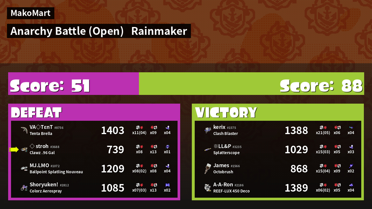 | Mode | Rainmaker - Anarchy Battle (Open) | ||
