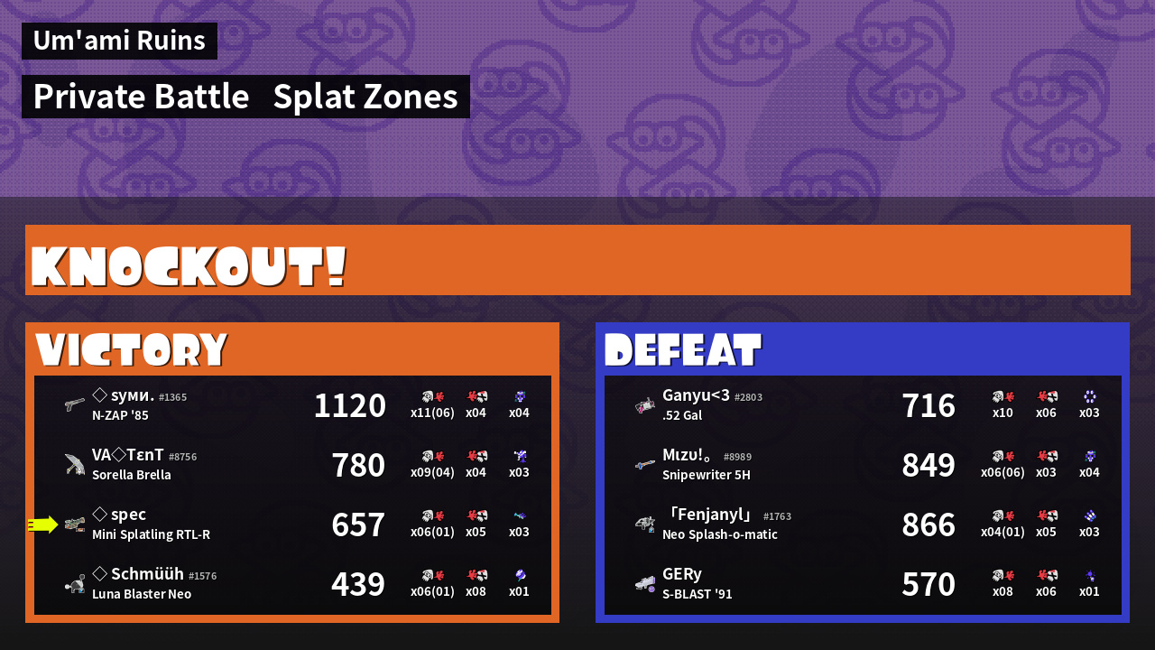| Mode | Splat Zones - Private Battle | ||