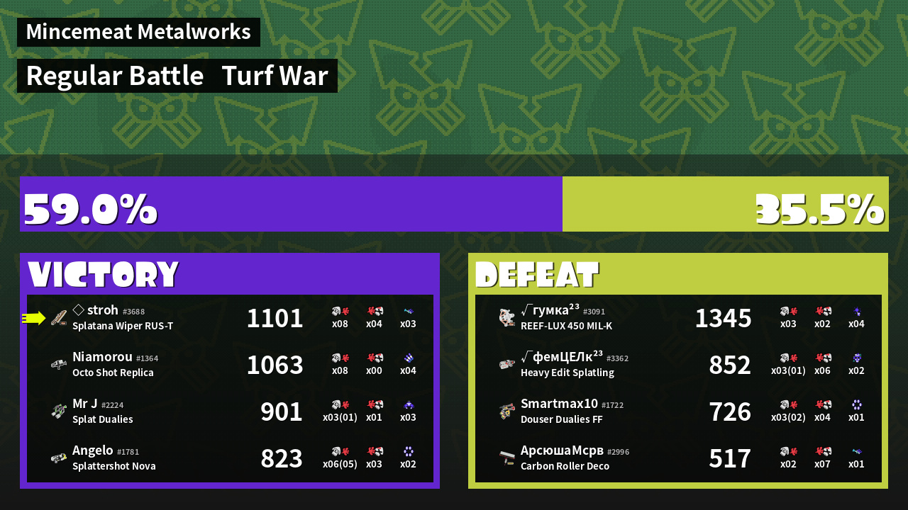 | Medals | #1 Overall Splatter #1 Turf Inker #1 Enemy-Base Inker | ||
