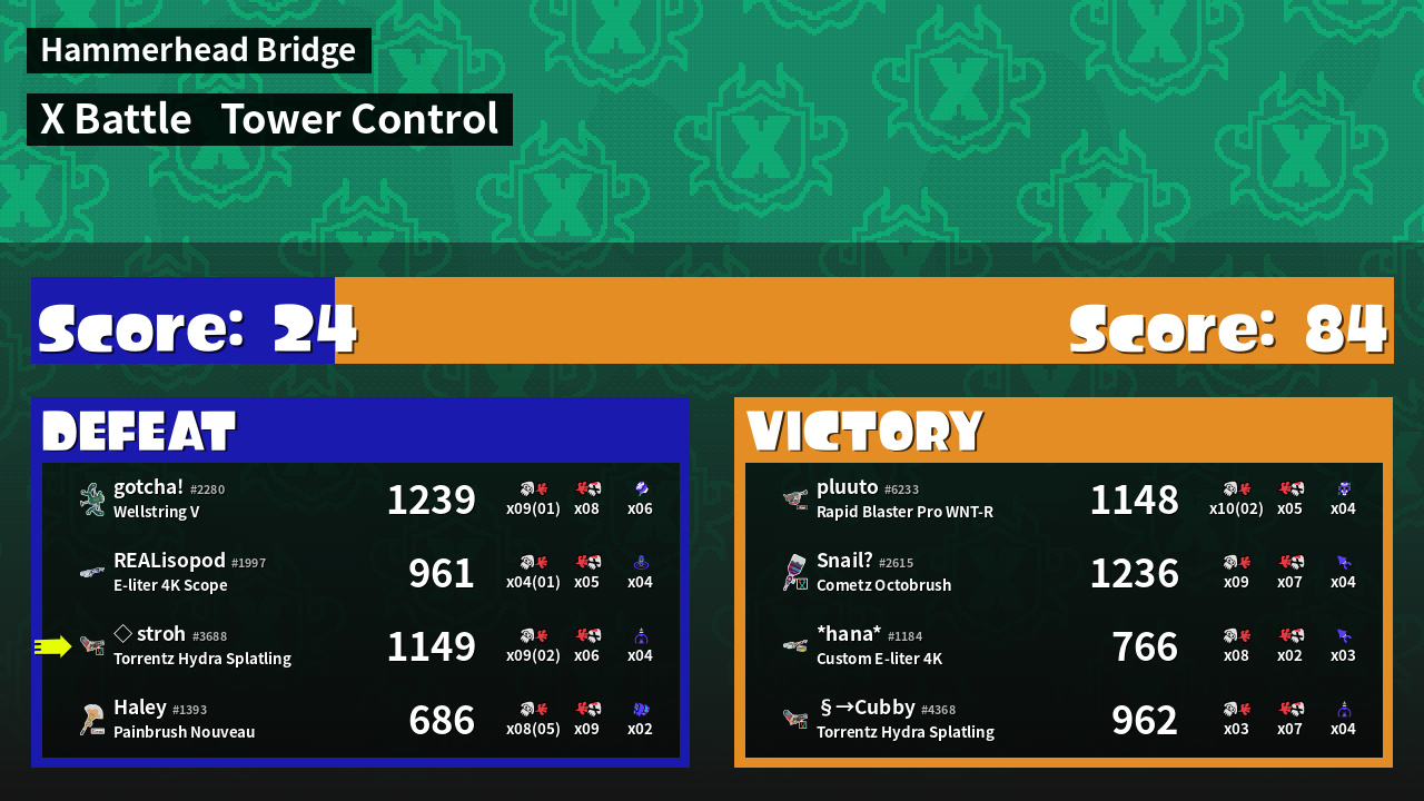 | Weapon |   Torrentz Hydra Splatling (  Sprinkler /   Big Bubbler) | ||