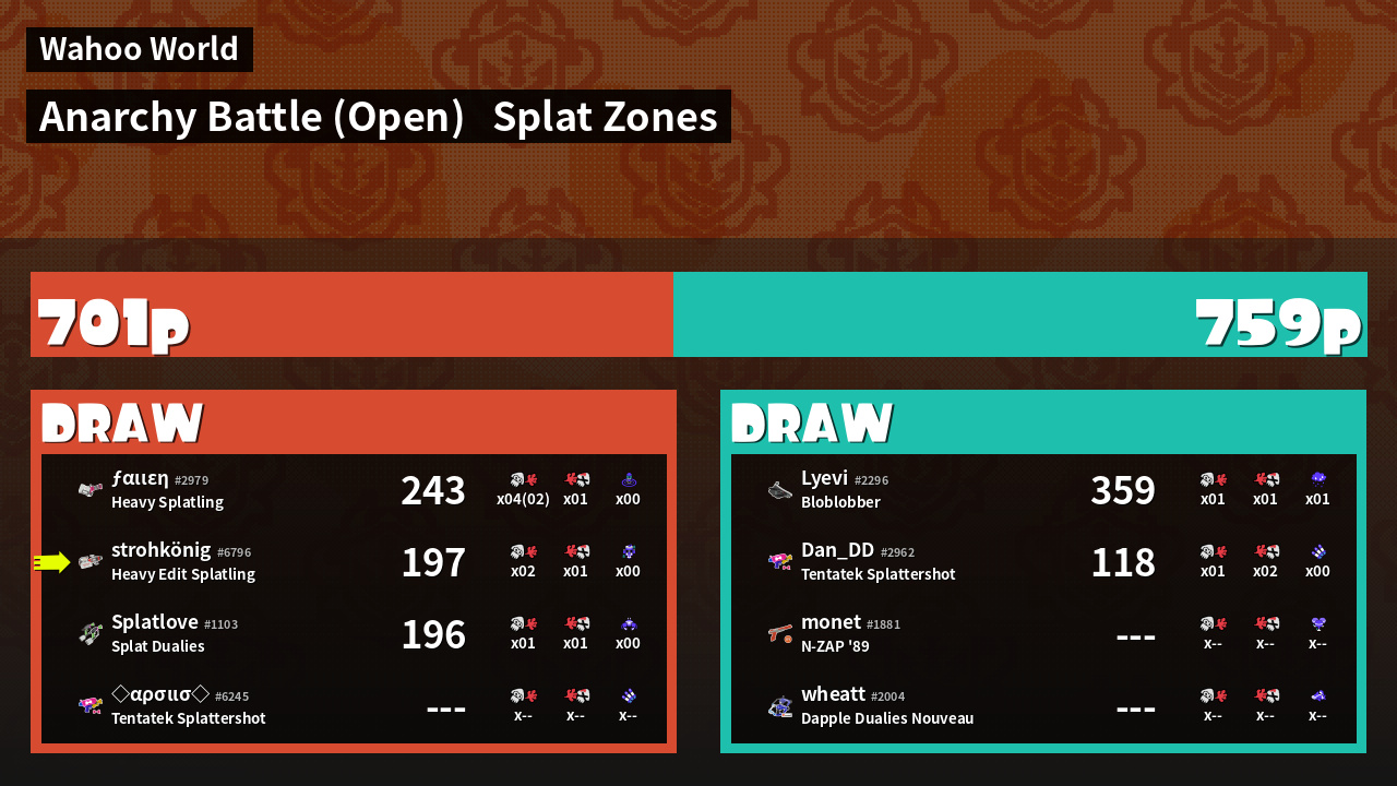 | Mode | Splat Zones - Anarchy Battle (Open) | ||