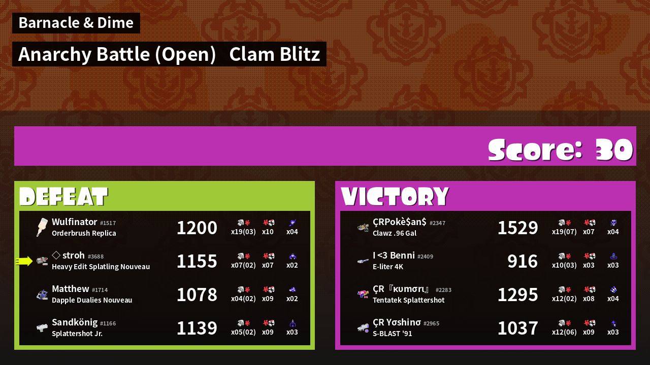 | Mode | Clam Blitz - Anarchy Battle (Open) | ||