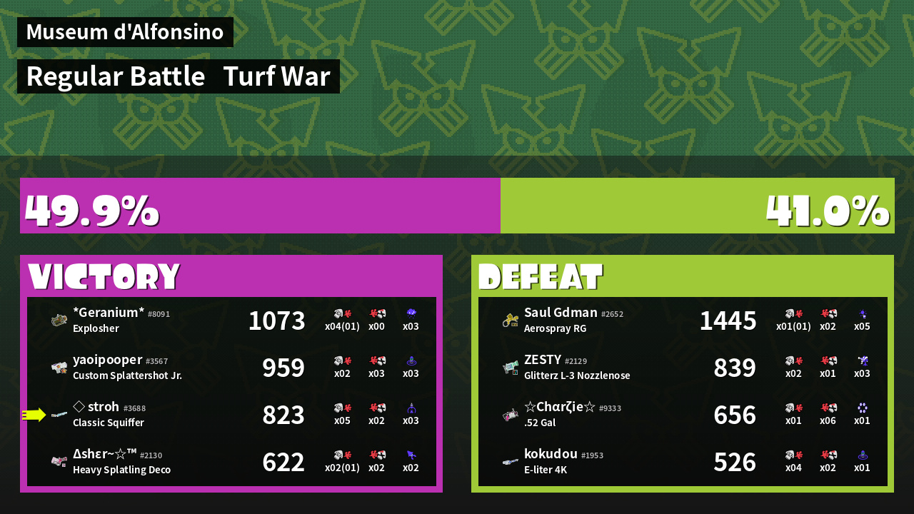 | Medals | #1 Overall Splatter #1 Popular Target #1 Enemy-Base Inker | ||