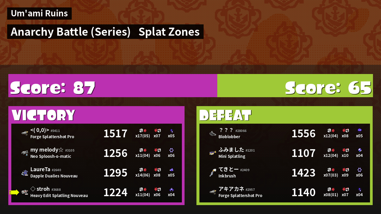 | Faraway Recollection  <( 0,0)> #5411 |  Forge Splattershot Pro                    | 1,517 | 12 + 5 | 7 | 1.71 |  5 | |