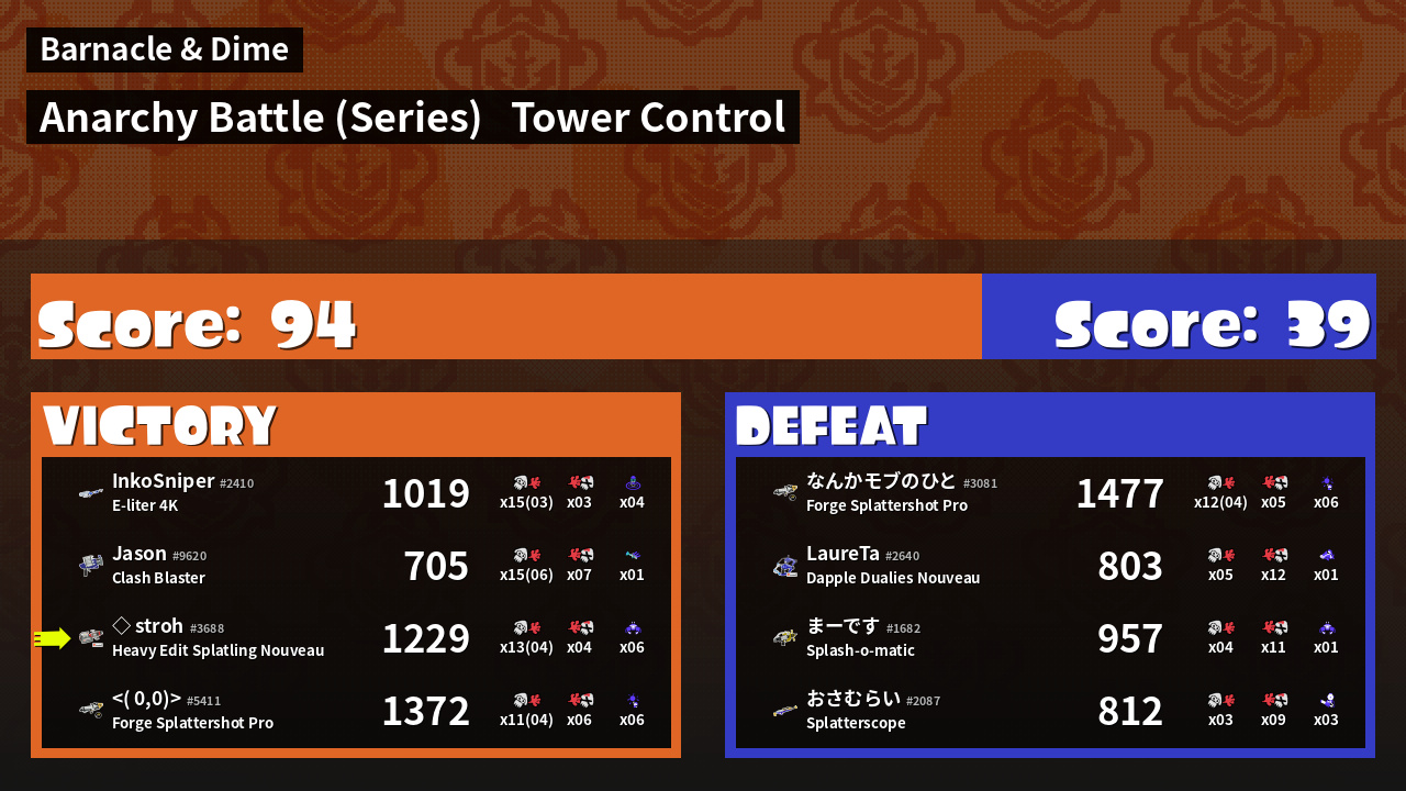 | Super-Duper Lucky Lucky Duck  ◇ stroh #3688 |  Heavy Edit Splatling Nouveau                    | 1,229 | 9 + 4 | 4 | 2.25 |  6 | |