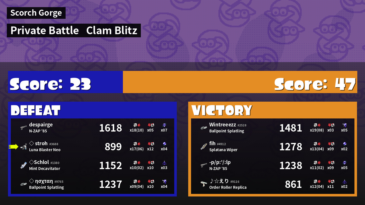 | Medals | #1 Enemy Splatter #1 Clam Stopper #1 Ground Traveler | ||