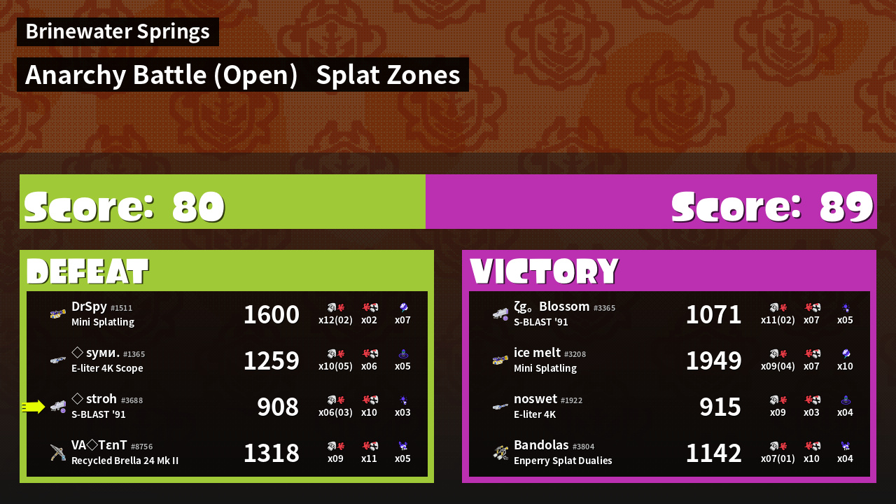 | Mode | Splat Zones - Anarchy Battle (Open) | ||