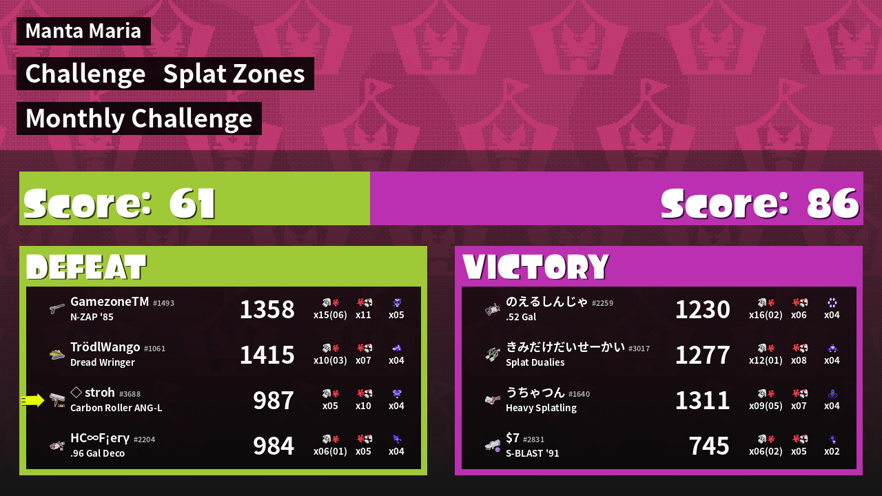 | Medals | #1 Splat Zone Inker #1 Super Chump User | ||