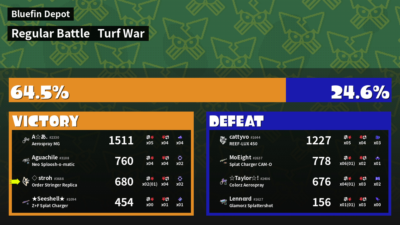 | Medals | #1 Splat Assister #1 Damage Taker #1 Ink Consumer | ||