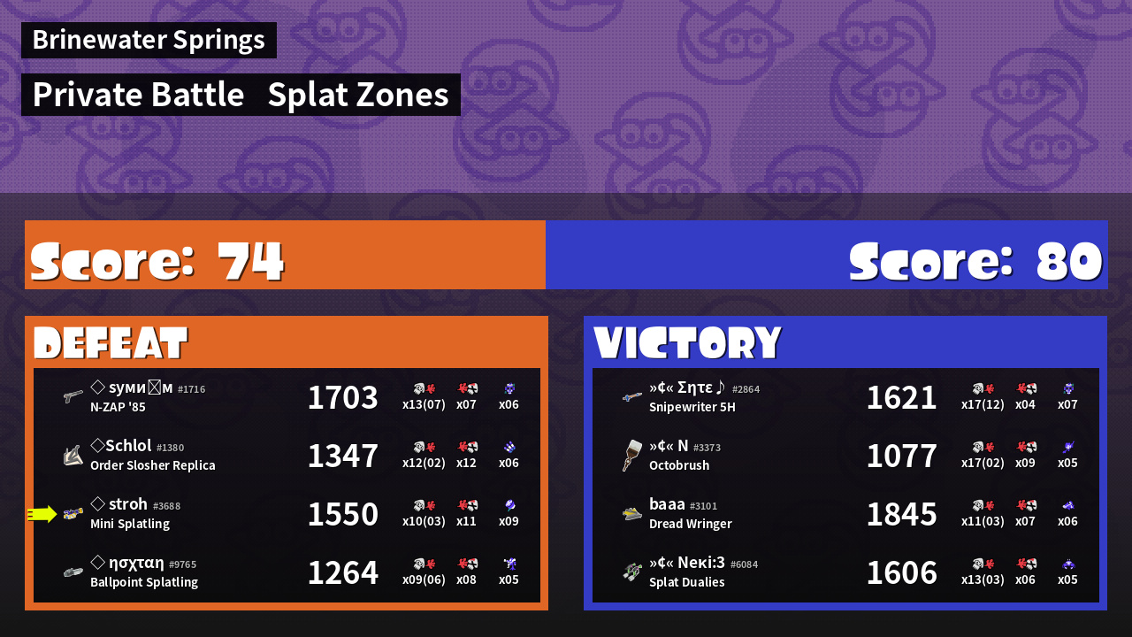 | Mode | Splat Zones - Private Battle | ||
