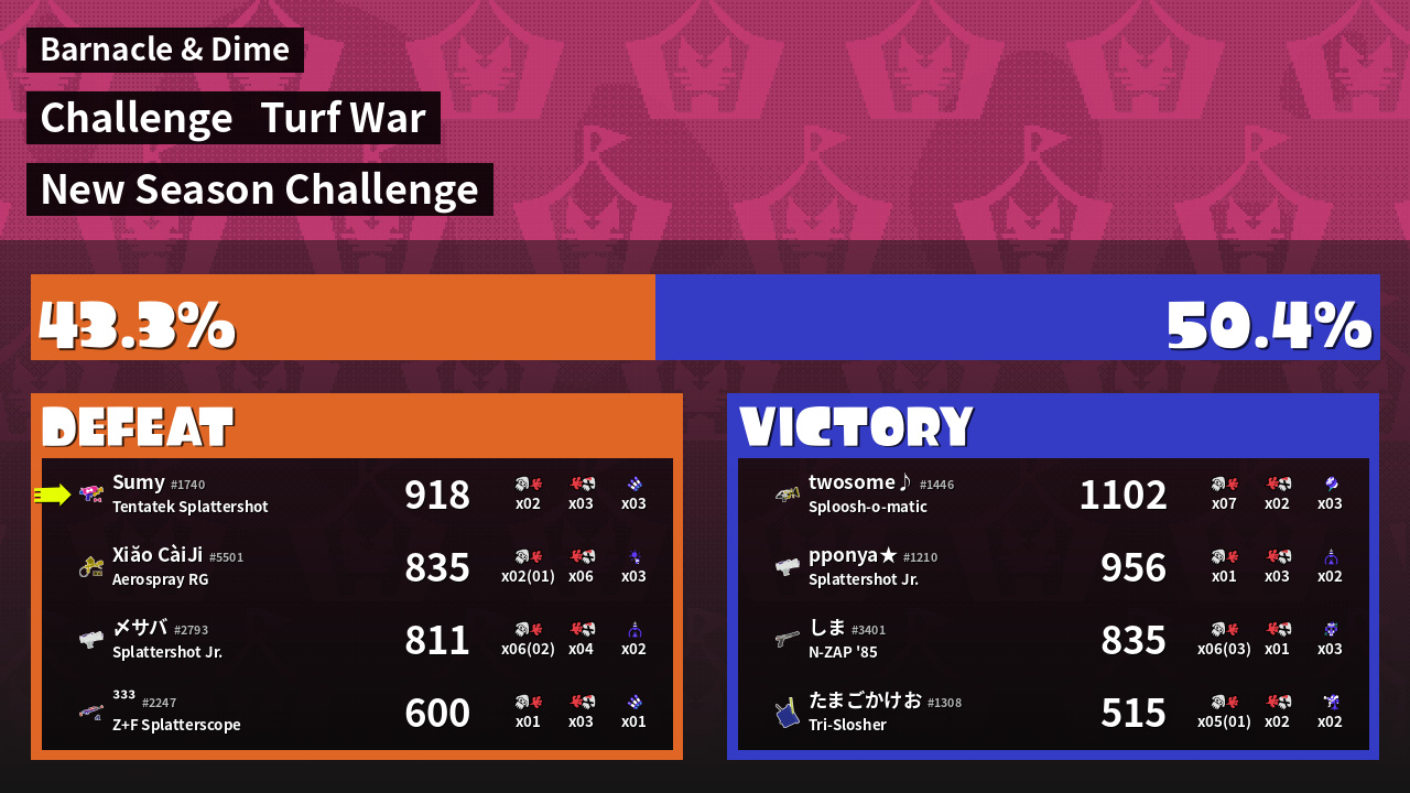 | 开朗的城市男孩 Sumy #1740 |  Tentatek Splattershot                    | 918 | 2 + 0 | 3 | 0.67 |  3 | |