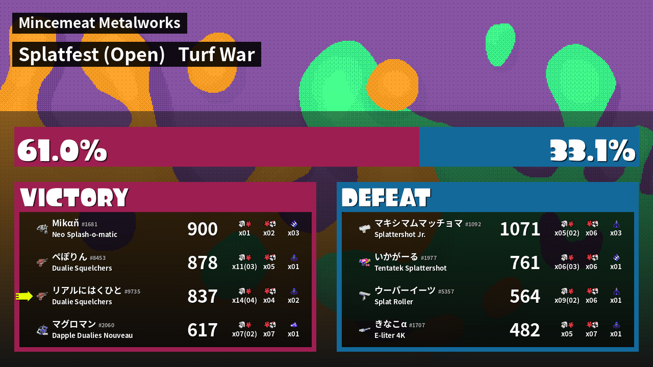 | Medals | #1 Overall Splatter #1 Enemy-Base Inker #1 Super Jump Spot | ||