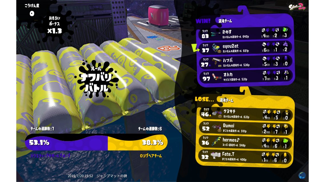 | Team 混沌 バラエティーブキガールグループ Win Streak: 7 | 2,330 | 18 / 9 | 2.00 66.67% | ||||