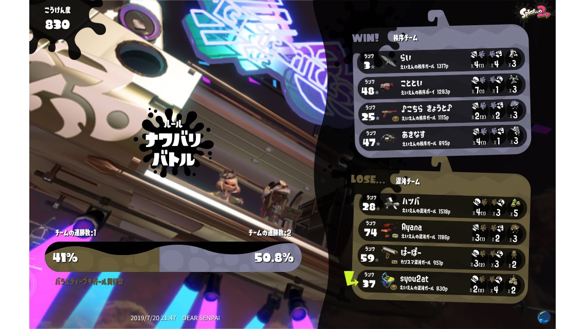 | Team 混沌 バラエティーブキガール同好会 Win Streak: 1 | 4,485 | 8 / 12 | 0.67 40.00% | ||||