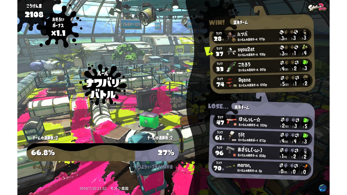 | Team 秩序 バラエティーブキイカ同好会 Win Streak: 2 | 2,885 | 7 / 9 | 0.78 43.75% | ||||