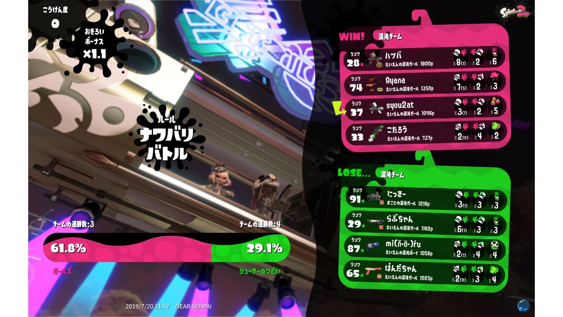 | Team 混沌 シューターのつどい Win Streak: 4 | 4,483 | 10 / 13 | 0.77 43.48% | ||||