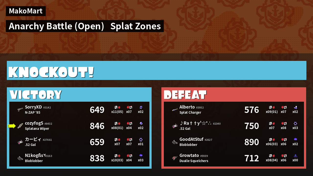 | Mode | Splat Zones - Anarchy Battle (Open) | ||