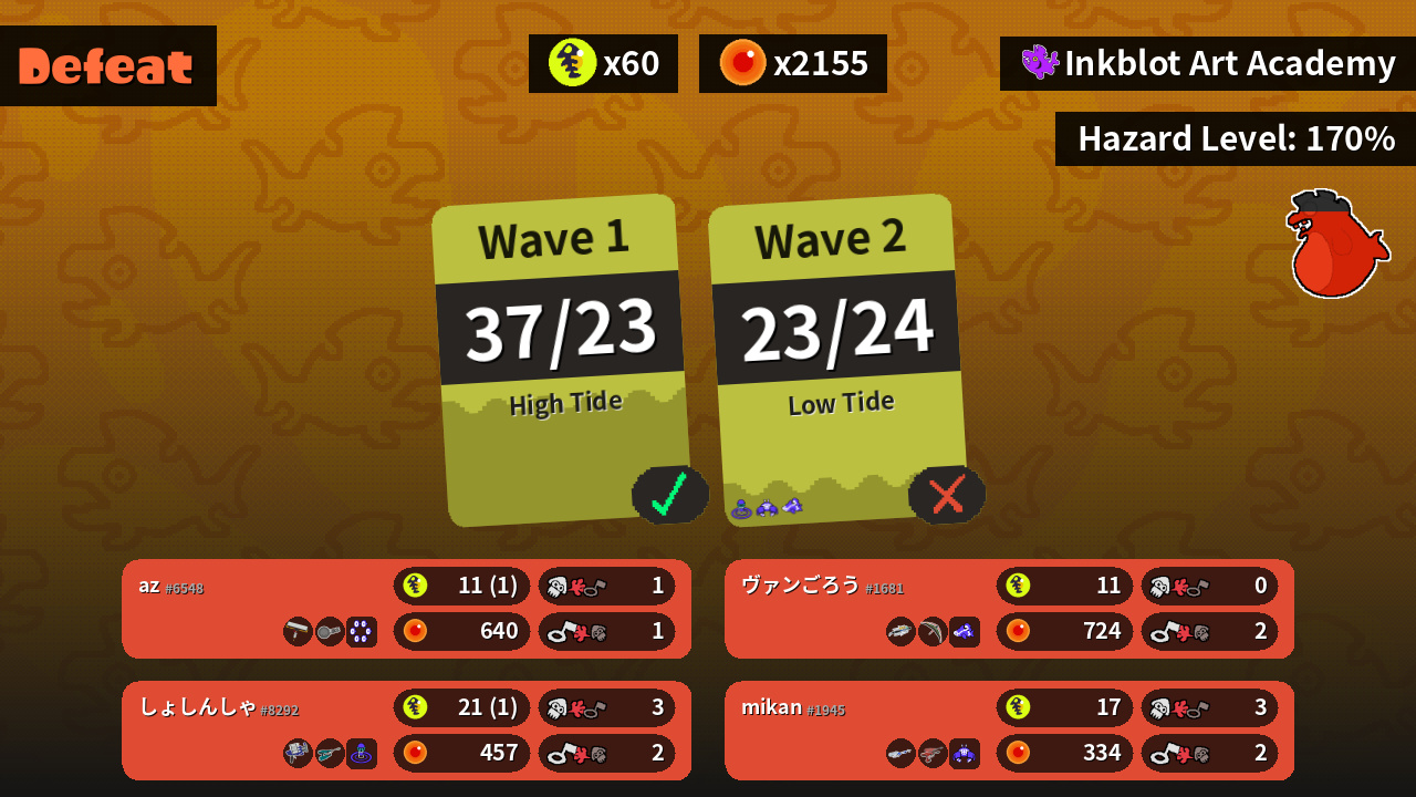 | Weapons | Carbon Roller Nautilus 47 | Clash Blaster Jet Squelcher | E-liter 4K Dualie Squelchers | Grizzco Brella Tenta Brella |