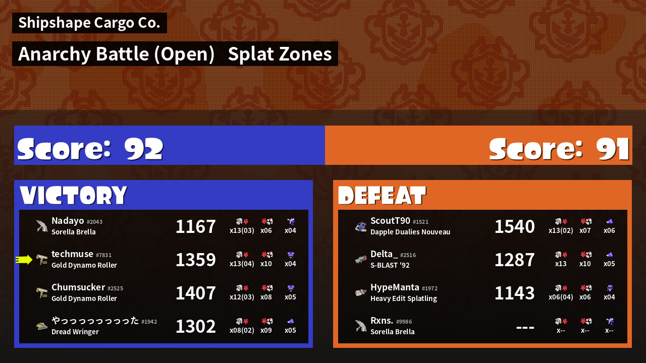 | Mode | Splat Zones - Anarchy Battle (Open) | ||