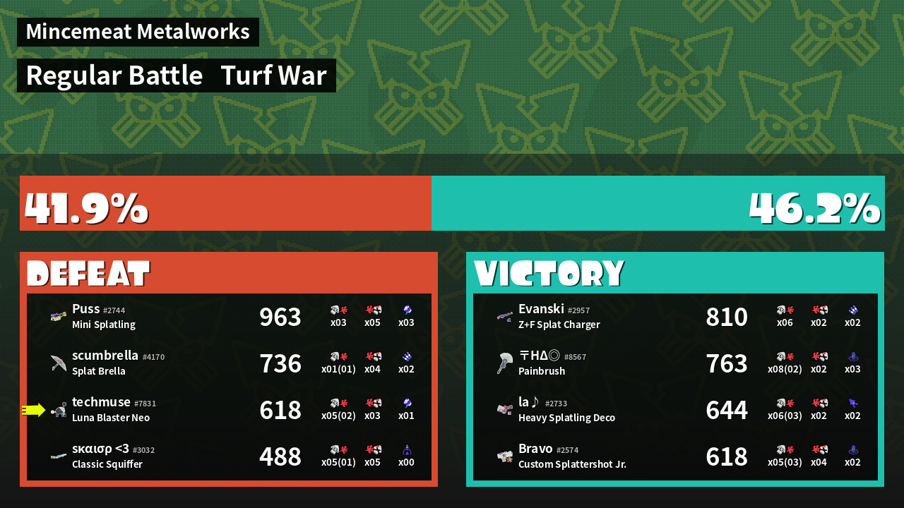 | Medals | #1 Overall Splatter #1 Enemy-Base Inker #1 Super Jump Spot | ||