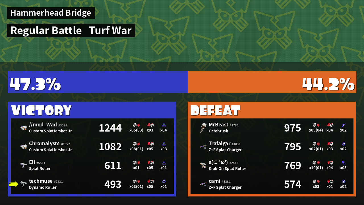 | Die-Hard Off the Hook Fan Chromalysm #1952 |  Custom Splattershot Jr.                    | 1,082 | 7 + 1 | 5 | 1.40 |  3 | |