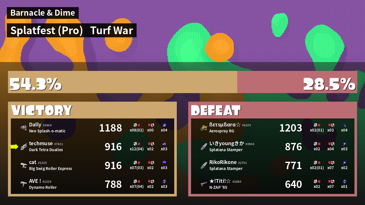 | Medals | #1 Overall Splatter #1 Popular Target #1 Enemy-Base Inker | ||