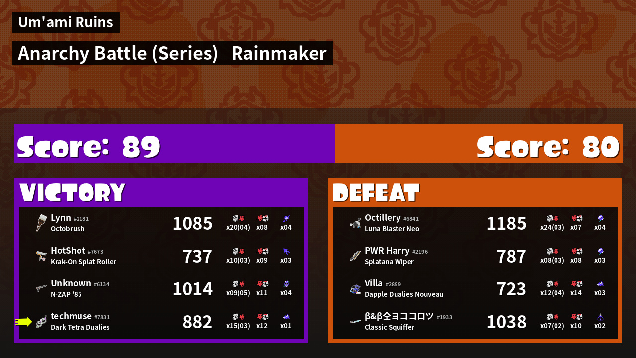 | Medals | #1 Popular Target #1 Damage Taker #2 Overall Splatter | ||