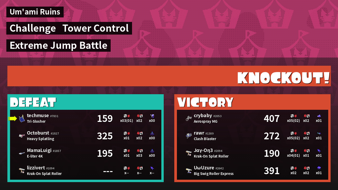 Kills / Deaths | 2 + 1 / 2 = Kill Ratio: 1.00 | ||