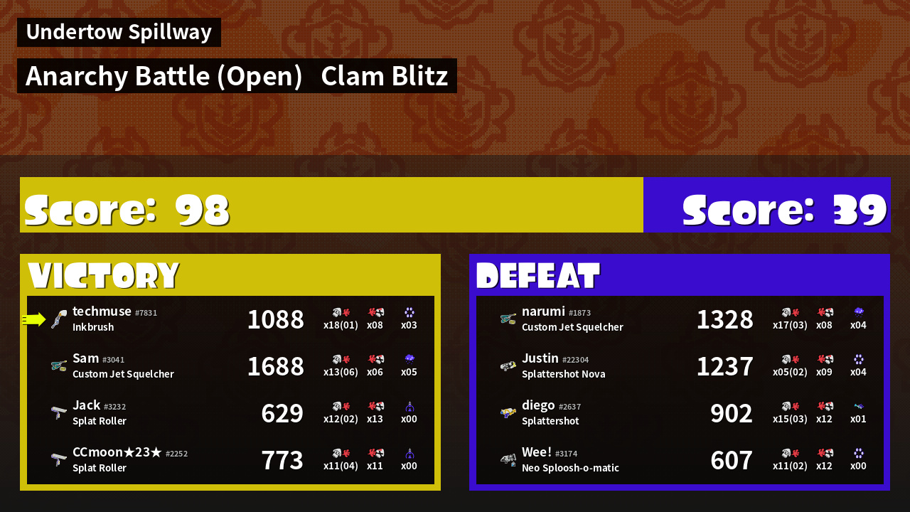 | Medals | #1 Overall Splatter #1 Score Booster #1 Clam Carrier | ||