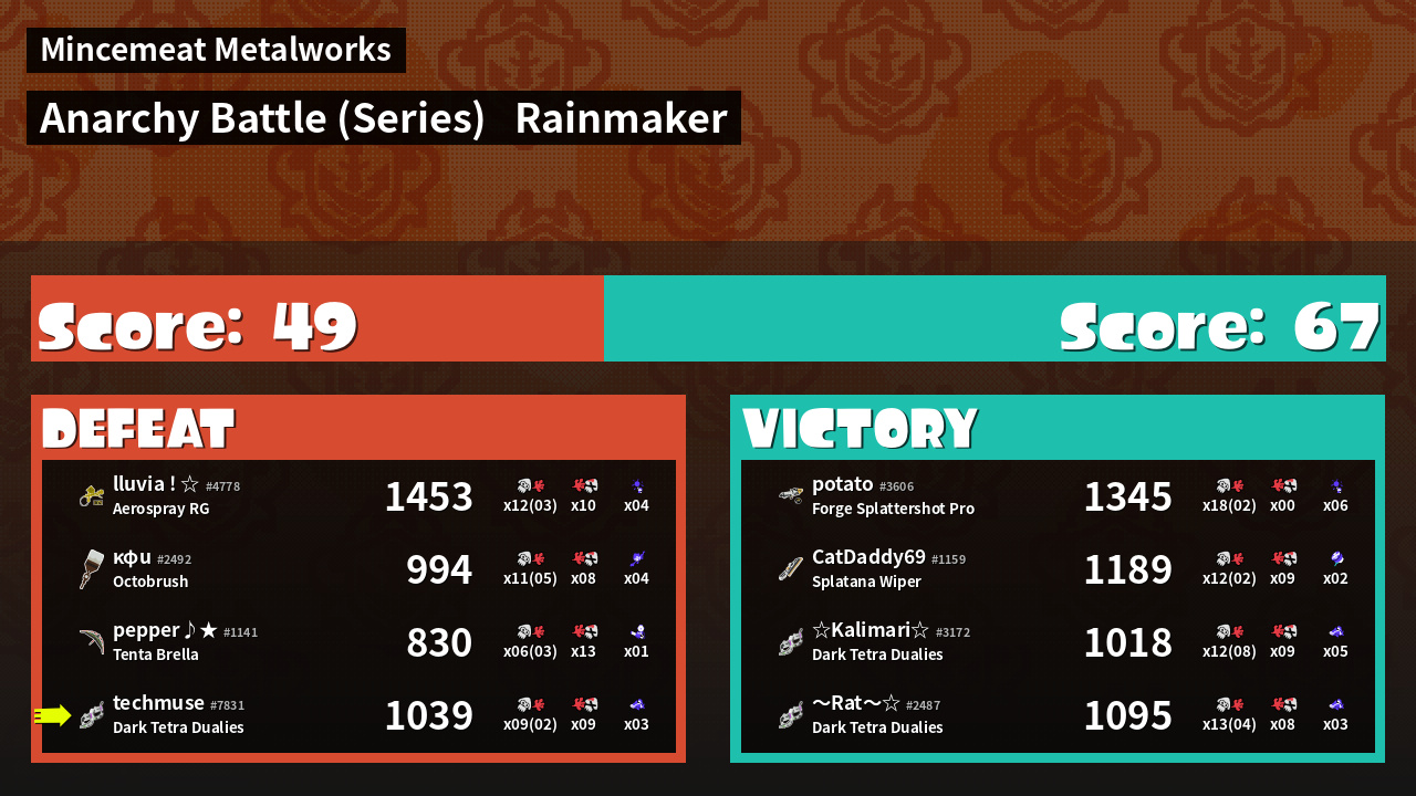 | Medals | #1 Damage Taker #2 Turf Inker #2 Enemy Splatter | ||
