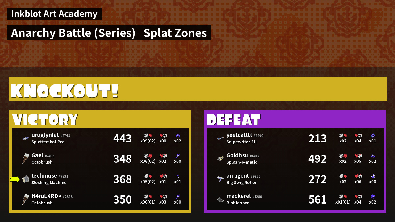 | Medals | #1 Splat Zone Inker #1 Splat Assister #1 Splat Zone Hero | ||