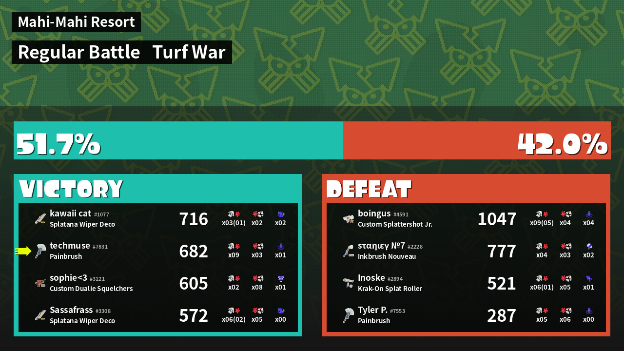 | Medals | #1 Overall Splatter #1 Popular Target #1 Home-Base Inker | ||