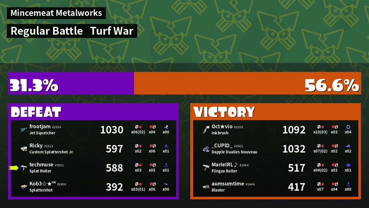 | Medals | #1 Home-Base Inker #2 Overall Splatter #2 Enemy Splatter | ||
