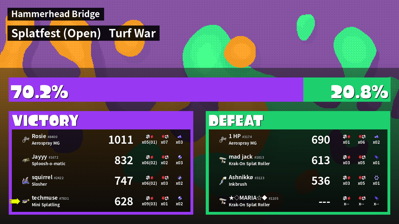 | Medals | #1 Overall Splatter #1 Enemy Splatter #1 Splat Assister | ||