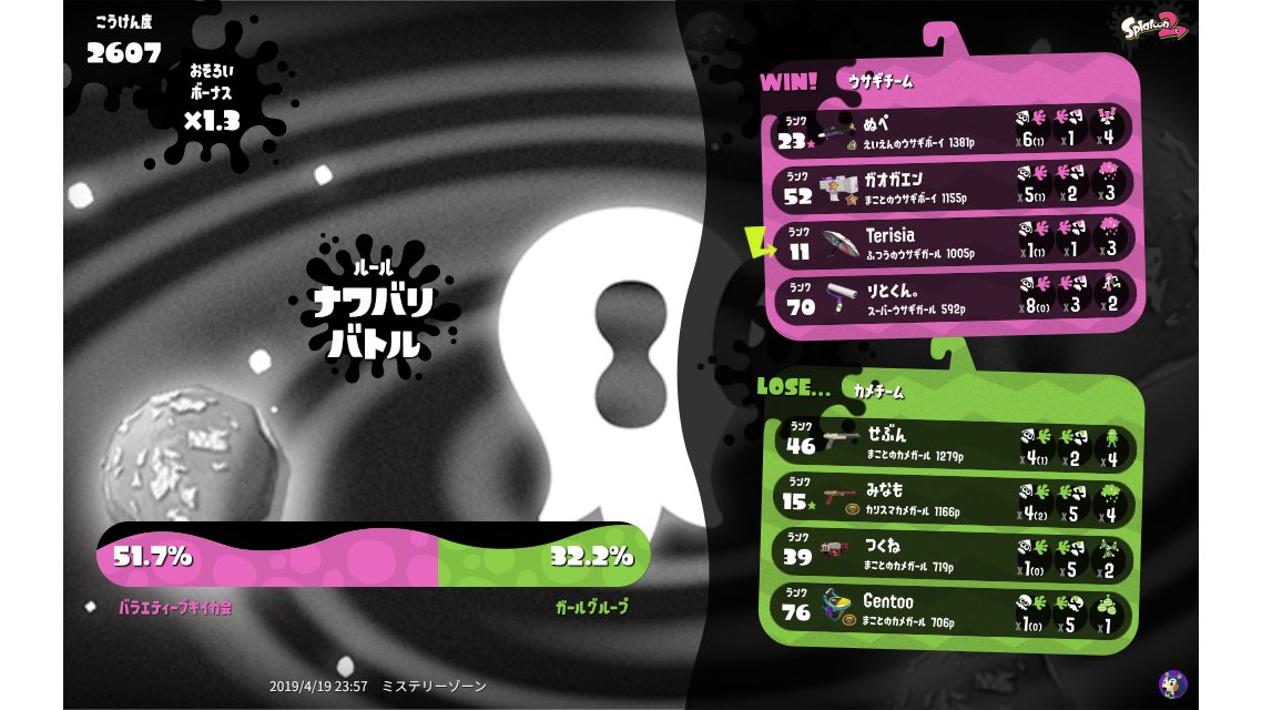 | Splatfest Title | ウサギ Fangirl 0 → ウサギ Fangirl 91 | ||||||||||||||||||||||||||||