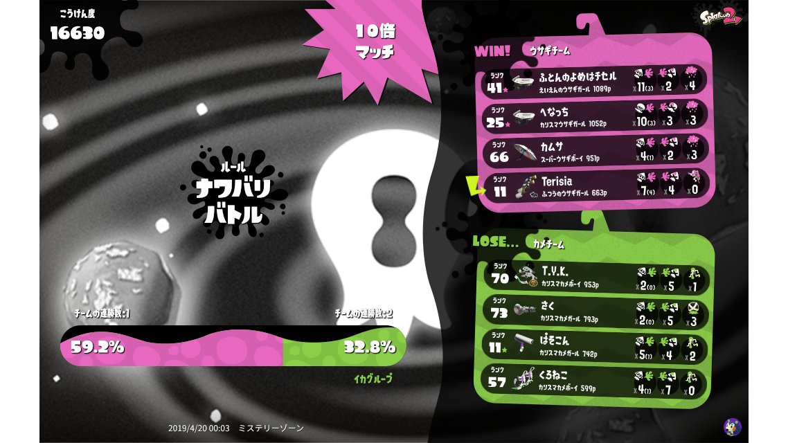 | Splatfest Title | ウサギ Fangirl 91 → ウサギ Fiend 71 | |||||||||||||||||||||||||||||||