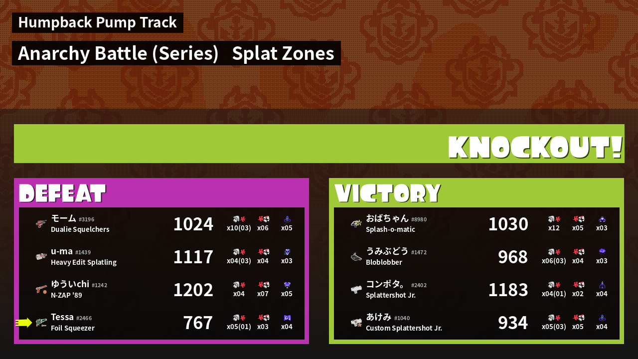 | Medals | #1 Splat Zone Guard #1 Damage Taker #1 Ink Consumer | ||