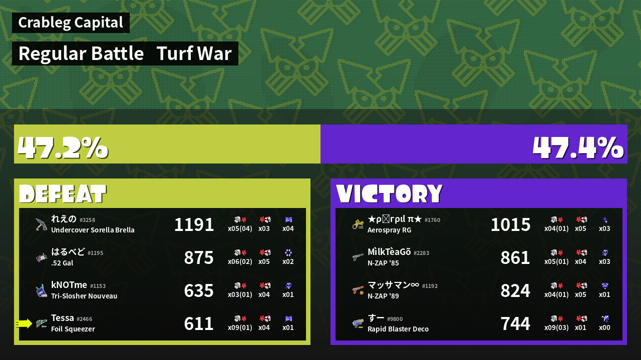 | Medals | #1 Overall Splatter #1 Popular Target #1 Enemy-Base Inker | ||